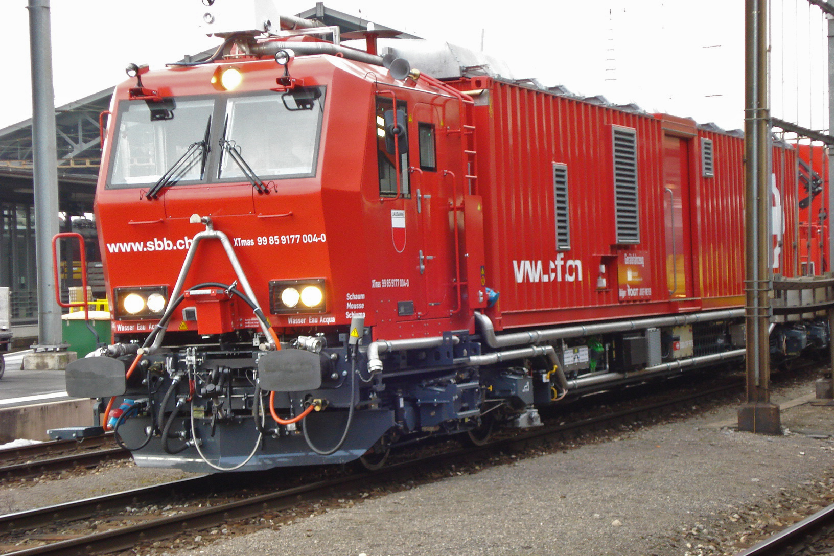 Pour mon premier message parmi vous, pas en tant que sapeur-pompier mais plutôt amateur de chemins de fer, après avoir fait une petite recherche sur ces Trains d'Extinction et de Sauvetage, voici une petite photo de ce nouveau TES Lausanne captée jeudi soir dernier 14/03 lors d'un bref arrêt en gare : il venait d'arriver sur voie 2, remorquant une automotrice Flirt. Mais je n'ai pas bien vu si ça venait de loin, et si la rame était vraiment en panne et donc que l'engin était en intervention, ou bien si c'était des exercices ou une formation. La rame remorquée a finalement été dételée puis remise sous tension sans problème particulier il me semble, et le TES a rejoint son stationnement dans l'avant-gare de Lausanne :